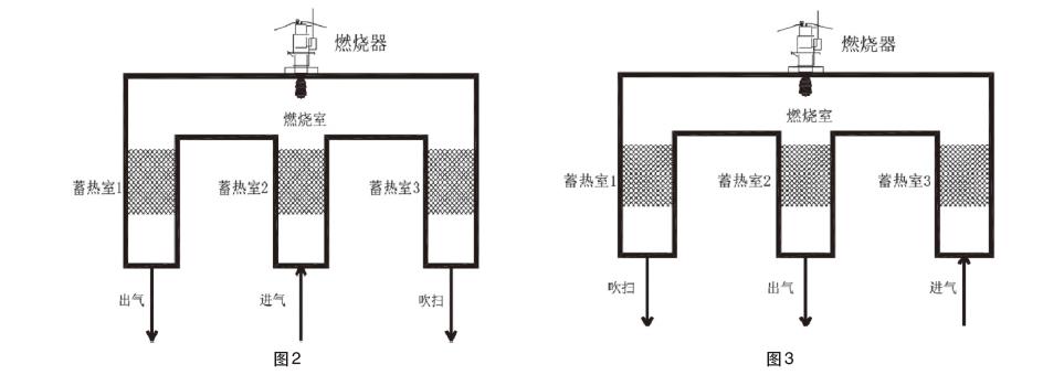 待蓄熱室3里面蓄熱體熱量吸附飽和后,切換閥進行切換,如圖2所示。廢氣進入蓄熱室3,經(jīng)過高溫預(yù)熱后,進入燃燒室,從蓄熱室2出,熱量為蓄熱室2所吸收,直至蓄熱室2吸附飽和,開始切換。如圖3所示進入下一個流程,3次切換為一個,如此運行。RTO切換閥切換時間,一般為60s-120s,切