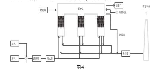 在廢氣處理項目中,3塔RTO一般與風(fēng)機,噴淋塔,阻火器,煙囪等組成一個系統(tǒng)。RTO一般正壓運行,風(fēng)機應(yīng)選擇變頻控制適應(yīng)不同工況。前置噴淋塔可吸收酸、堿性廢氣,減少對RTO爐的腐蝕。后置噴淋塔可進一步降低廢氣排放量。有的有熱回收需求,可在末端增設(shè)熱交換器,產(chǎn)生熱水和熱氣回用。煙囪可根據(jù)項目需要設(shè)計,一般至少為15米高,煙囪越高對廢氣擴散有利,成本也越高。系統(tǒng)的組成需要根據(jù)項目來設(shè)定,圖4為某RTO項目工藝流程圖(供參考)。