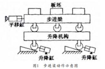500機(jī)組加熱爐目前采用的是推鋼式出鋼,此種方式容易產(chǎn)生黑印、 粘鋼等弊端, 嚴(yán)重影響鋼材軋制的質(zhì)量, 應(yīng)改為目前為常用的步進(jìn)梁出鋼方式。 步進(jìn)梁式系統(tǒng)具有技術(shù)成熟、 出鋼高效等點(diǎn), 其動(dòng)作方式如圖1所示: